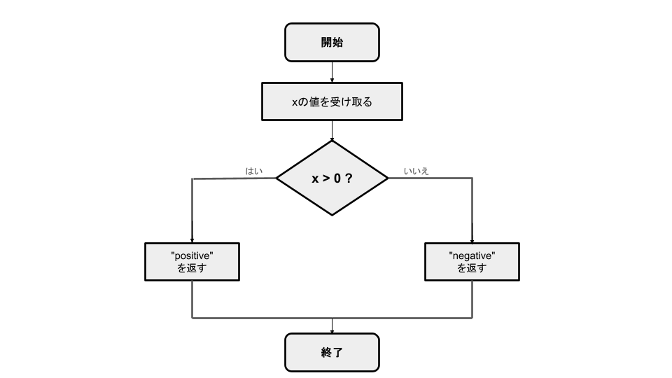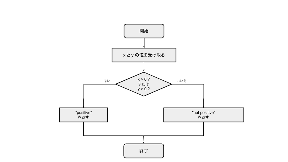 このフローでは、命令の内容を「受け取ったxの値にpositive もしくは negative を返す」ことのみに絞りこんでいます。出力の分岐には「xが0より大きい場合」と「xが0以下の場合」の2つがありますが、このうち片方のテストケースを実行するだけで、命令カバレッジは100%となります。