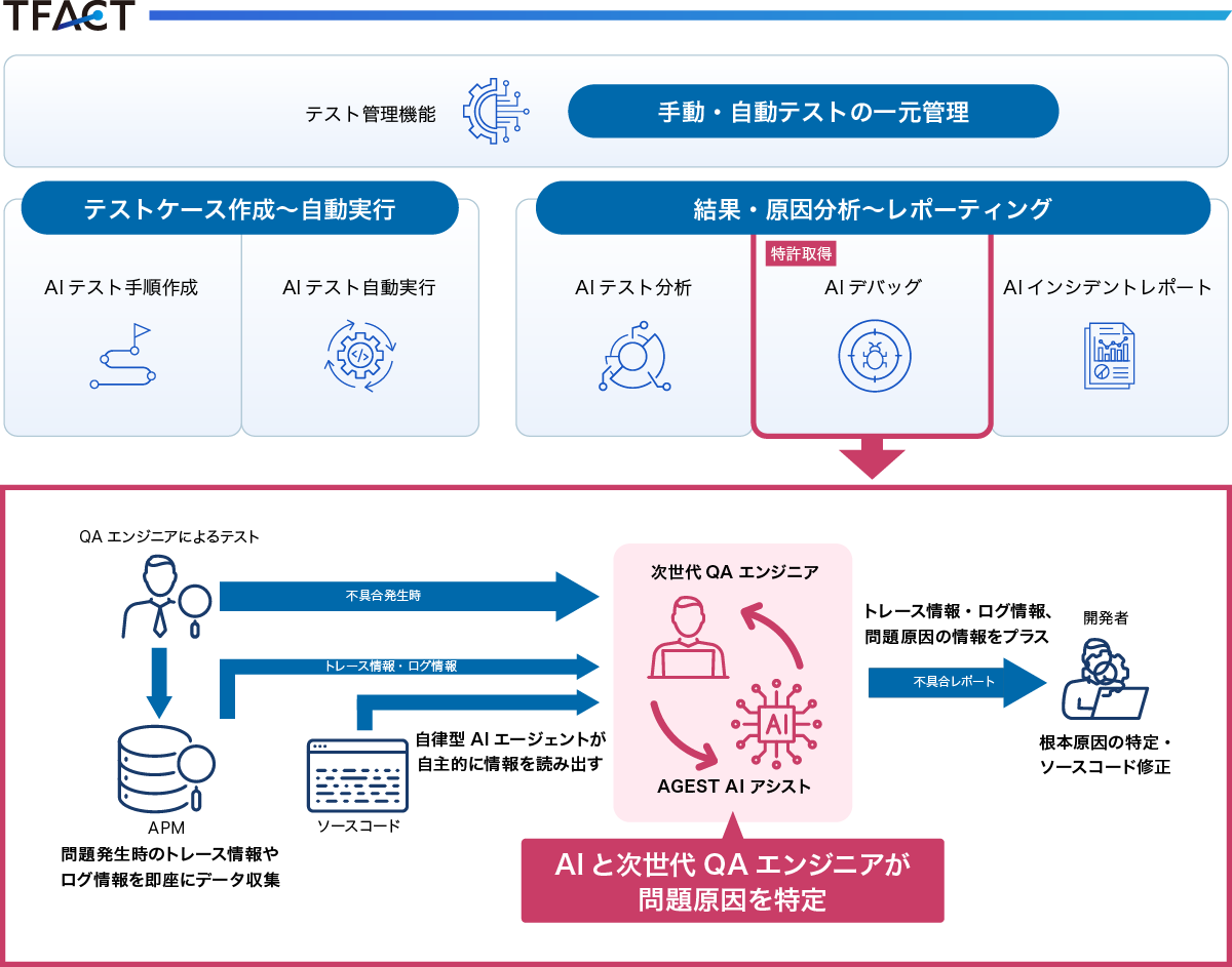 「AIデバッグ」は、AGESTが誇るAIテスト管理ツール「TFACT」に実装された、先進的なデバッグソリューションです。