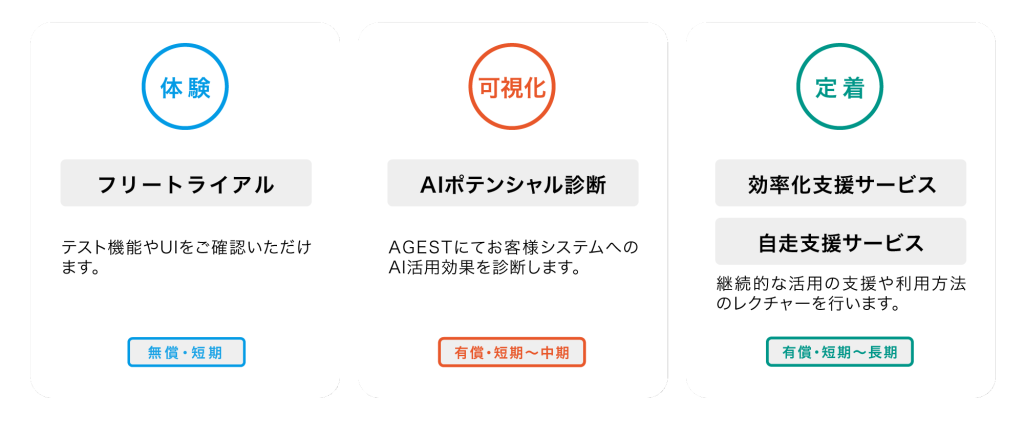 AGESTでは、これらの課題を解決するソリューションとして、企業の規模や業種を問わず、高度なAIテスト環境をご利用いただける「TFACT」SaaS版を提供しております。そして、この「TFACT」を導入いただくための前段階として、お客様のシステムにAIを導入するにあたってどの程度の効果を発揮するのかを検証する「AIポテンシャル診断サービス」および診断で見えたポテンシャルを現場で最大限に引き出す「効率化支援サービス」を新たに開始することで、AI導入の意思決定から運用定着までを強力に支援します。